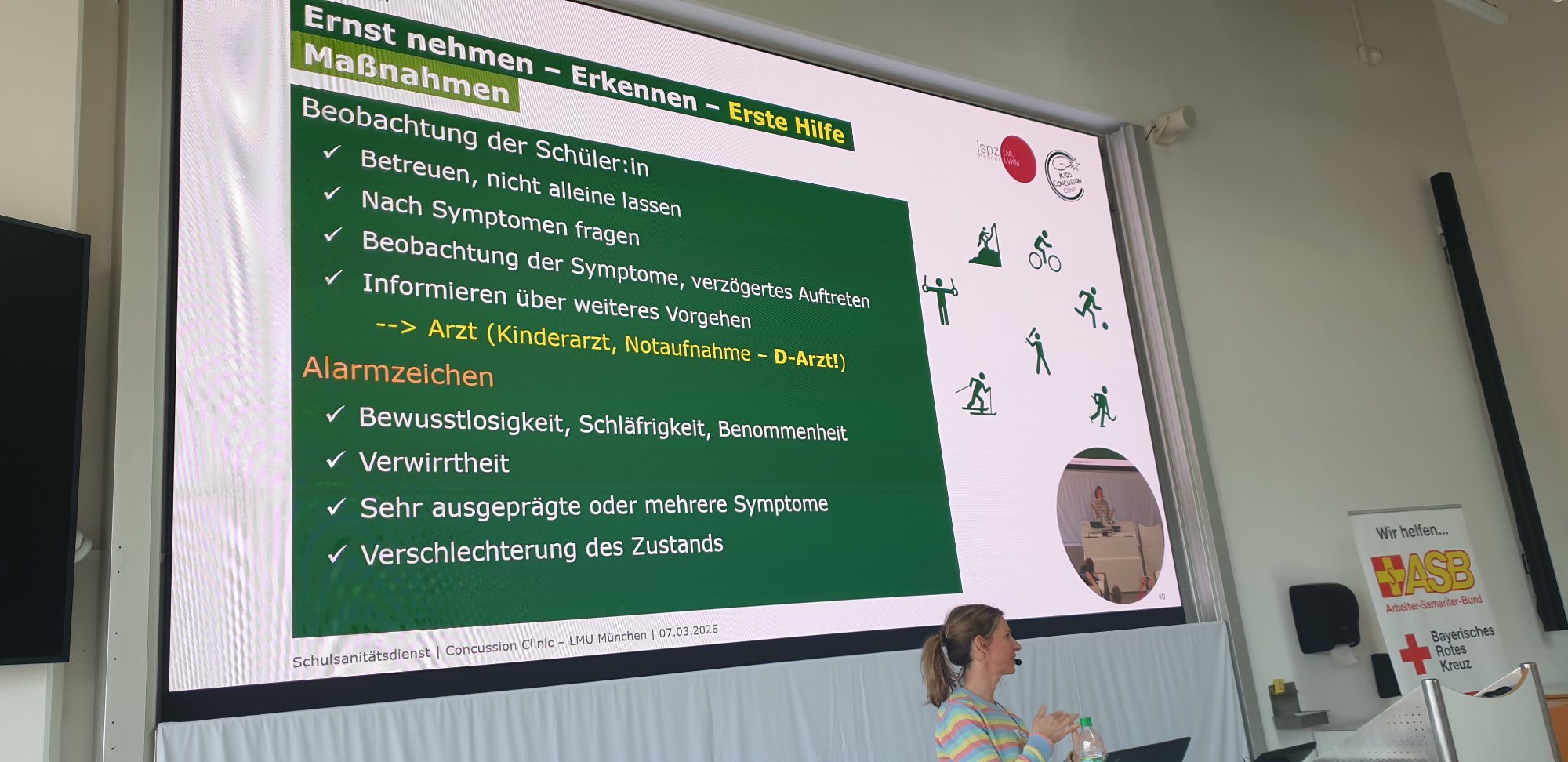 Den Abend ließen wir entspannt ausklingen, denn am Samstagmorgen ging es für uns mit dem Zug schon weiter nach Rosenheim. Dort wurden wir an der Technischen Hochschule Rosenheim sehr freundlich empfangen und starteten den Tag mit einer gemeinsamen Begrüßung. Neben einigen Grußworten konnten wir durch eine Referentin der Concussion Clinic der LMU München mehr über Symptome und Behandlungsmöglichkeiten bei Gehirnerschütterungen erfahren und so einen tieferen Einblick in dieses Krankheitsbild gewinnen.